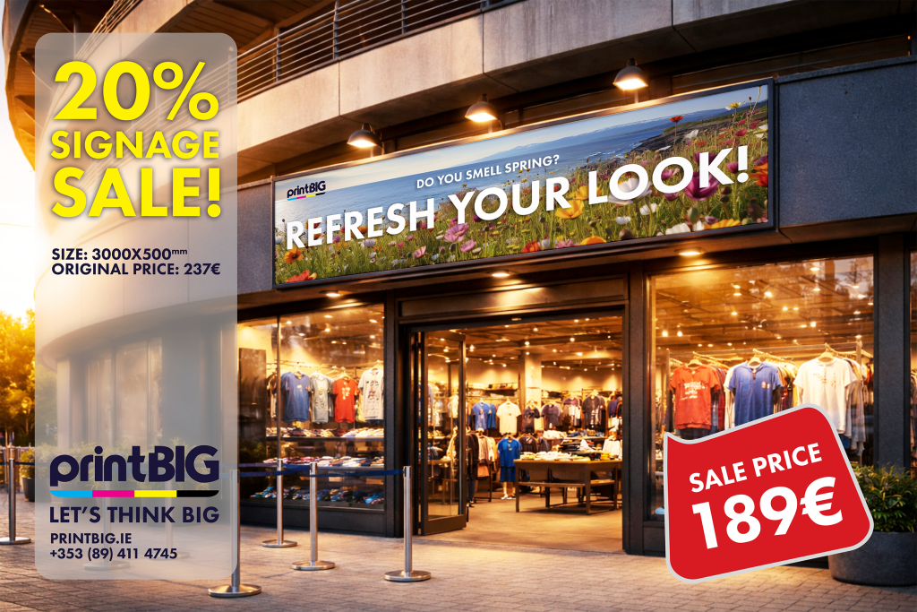 DO you smell spring? Refresh your look! Choose the 3000x500mm shop signage and save 20%! Now only 189€!